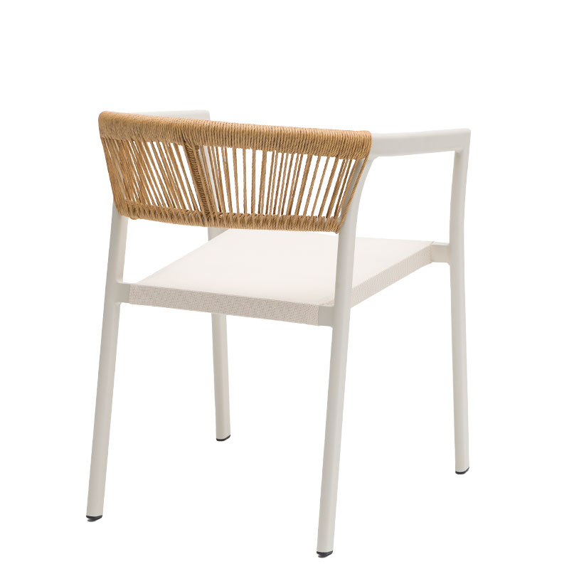 Fauteuil avec une touche orientale, doté d’un dossier en roope et d’un siège en textilène. Empilable